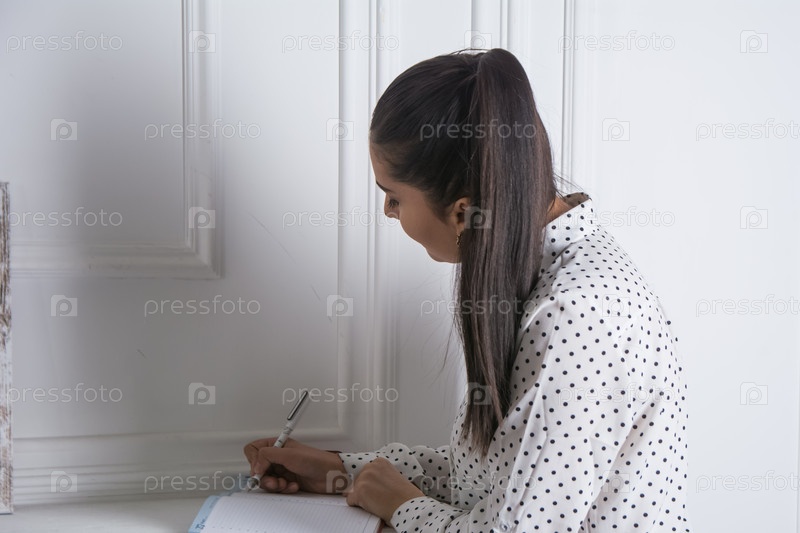 Девушка азиатской национальности в роли офисного менеджера с блокнотом в руках