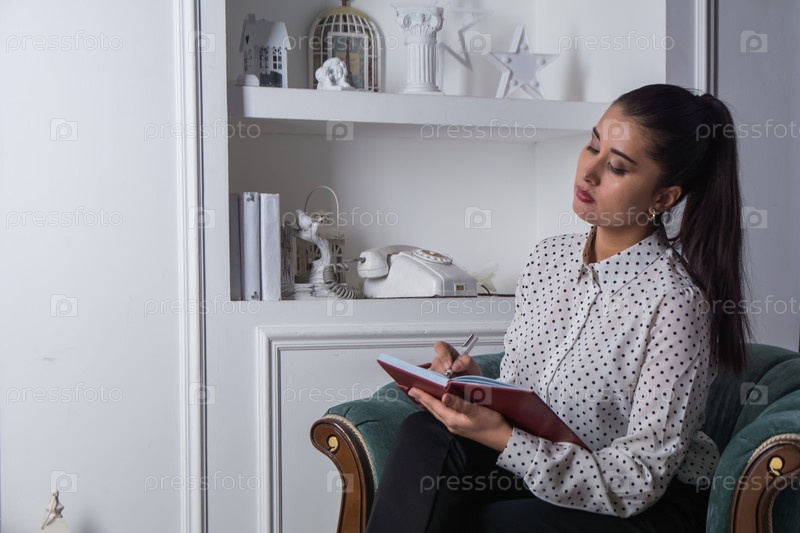 Девушка азиатской национальности в роли офисного менеджера с блокнотом в руках