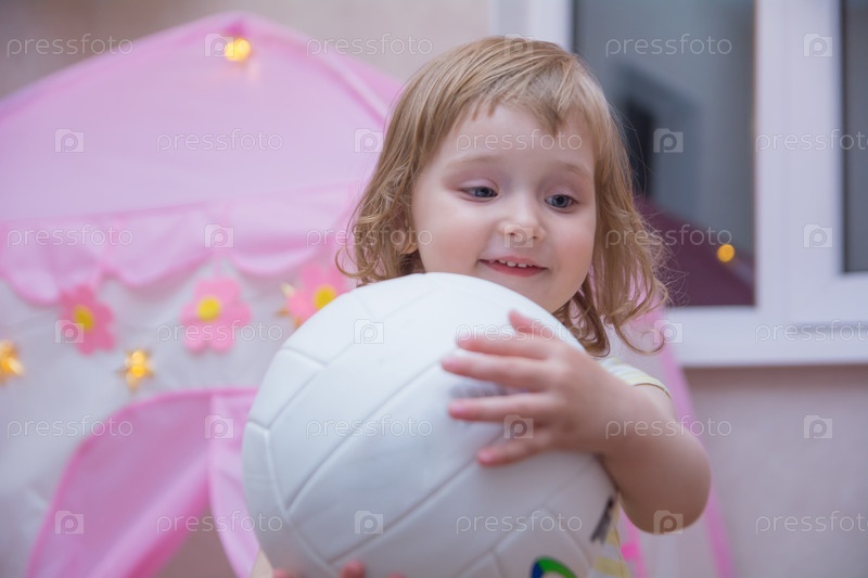 Маленькая девочка играет с мячом