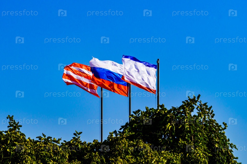 Флаги России, Крыма и города Керчь на горе Митридат. Керчь. Крым