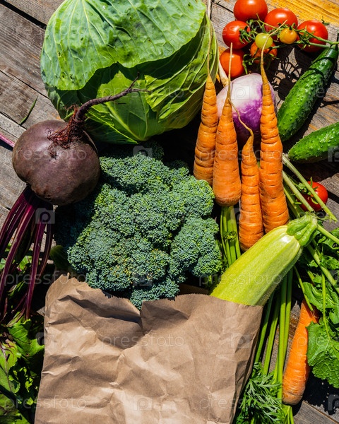 Разноцветные овощи в коричневом бумажном пакете для покупок на деревянном столе. Разные овощи на столе из темного дерева. Сырые овощи из магазина. Продукты в бумажном эко-пакете