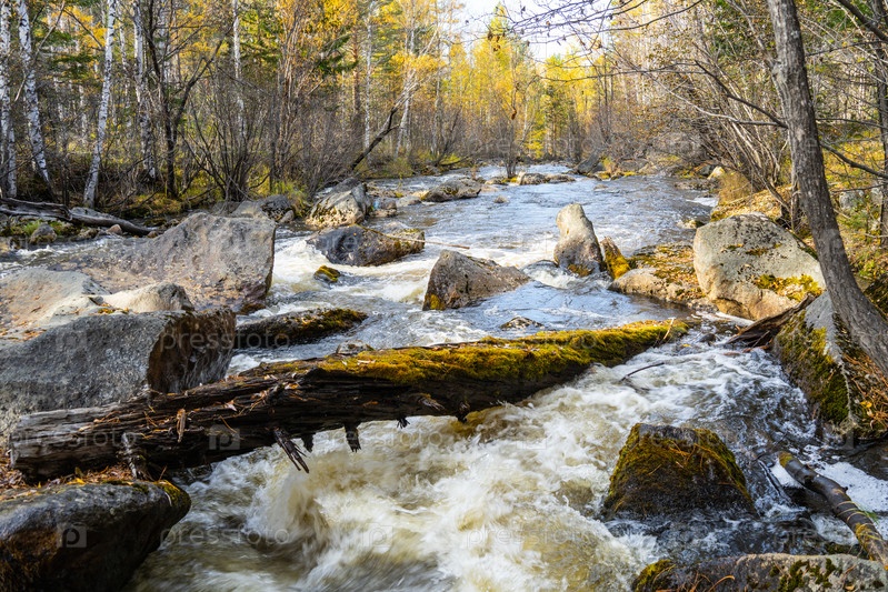 Бустрый поток реки на камнях, осеннего леса. Осенний лесной и горная река. Речной поток в горах. Горный речной поток в лесу