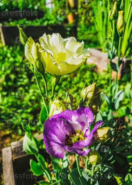 Эустома с фиолетовыми и белыми цветами. эустомы на фоне листьев, растущих на цветочной клумбе. Цветы лизиантуса в саду