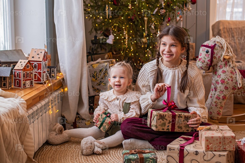 Две сестры сидят рядом с елкой и подарками в интерьере загородного дома. Теплая уютная атмосфера в винтажном стиле кантри