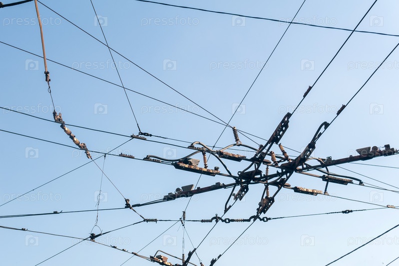 Промышленный городской фон, переплетение кабелей над улицей на пересечении контактных проводов троллейбуса