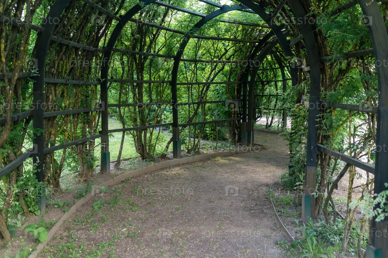 Вид изнутри тенистой перголы в парке
