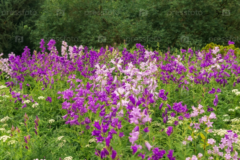 Пейзаж, поле фиолетовых колокольчиков на опушке леса крупным планом