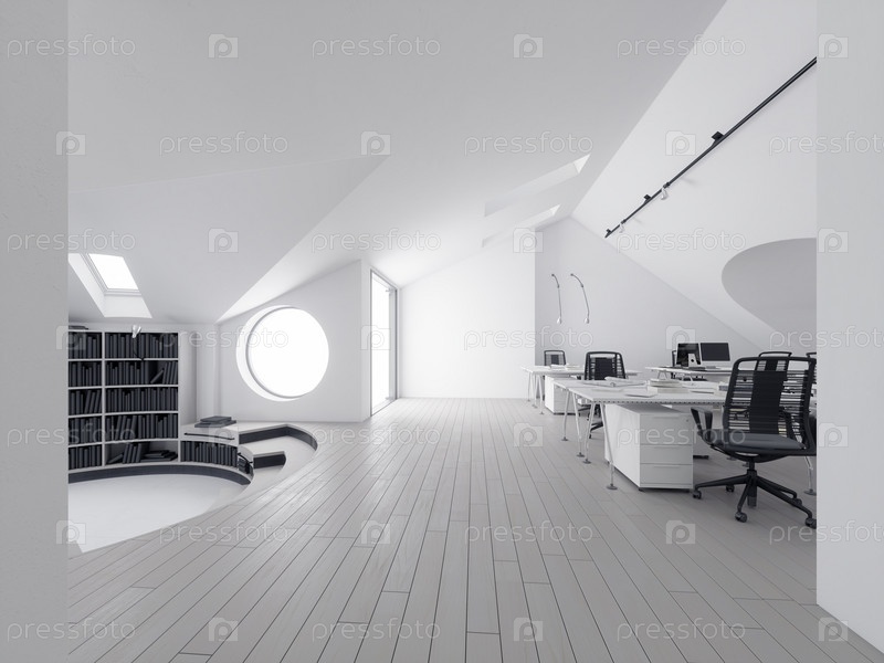 Минималистский офис с эргономичными стульями и чистым белым дизайном. 3D-рендеринг