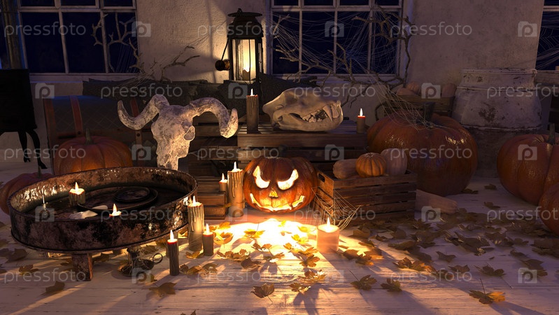Жуткая сцена Хэллоуина с черепами, тыквами,
