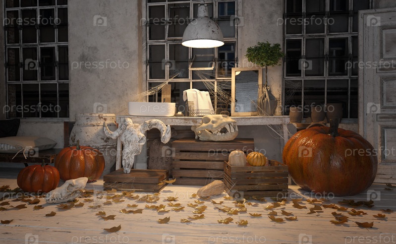 Ужасная сцена Хэллоуина с черепами, тыквами и свечами. 3D