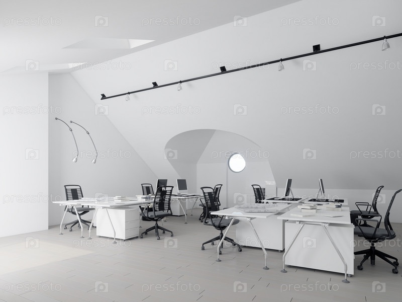 Минималистский офис с эргономичными стульями и чистым белым дизайном. 3D-рендеринг