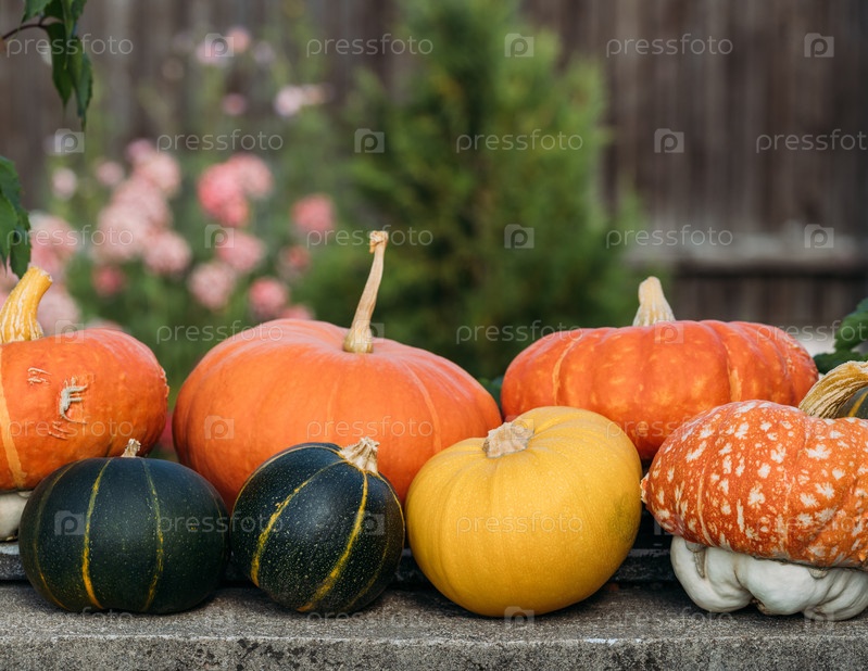 Спелые тыквы и кабачки в саду. Осенний урожай разных сортов тыкв