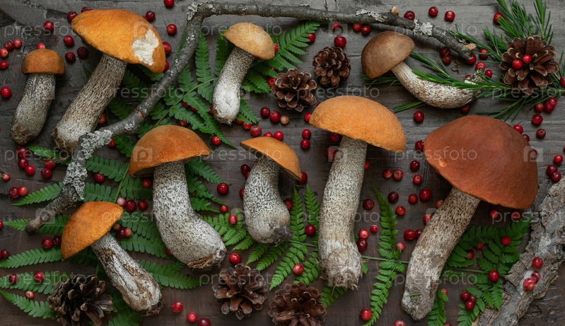 Осенний грибной фон с зелеными листьями, ягодами и шишками. Подосиновики на деревянном фоне. Вид сверху, плоская планировка