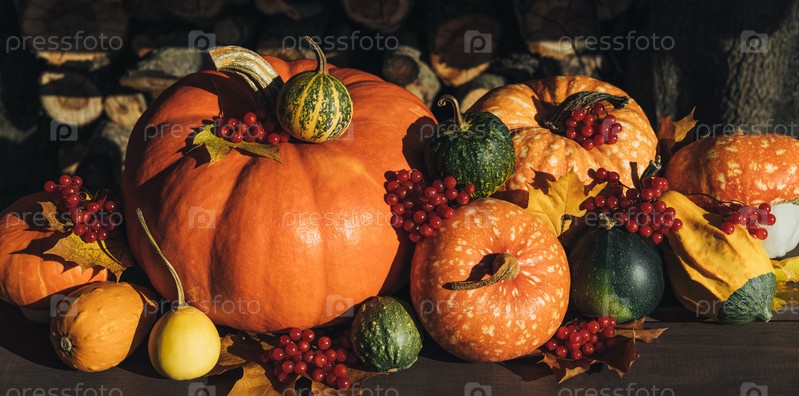 Осенняя композиция с тыквами, ягодами и листьями крупным планом. Красивый осенний фон тыквы