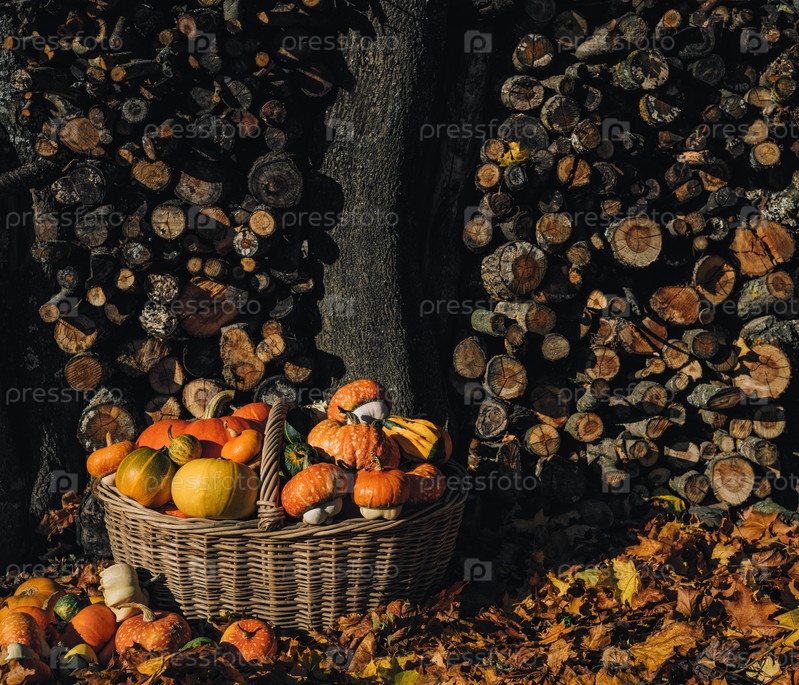 Тыквы в большой плетеной корзине на фоне поленницы. Красивая осенняя композиция с разными сортами тыкв в корзине