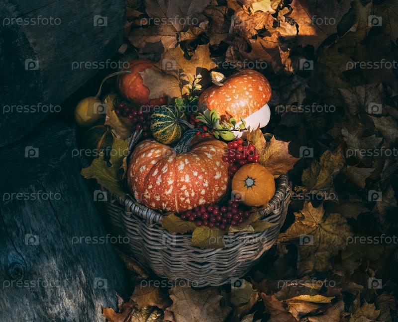 Декоративные тыквы в корзине крупным планом. Красивая осенняя композиция с тыквами, красными ягодами и листьями