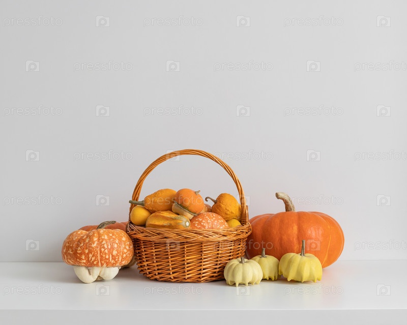 Осенний урожай тыкв в корзине на белом фоне. Различные сорта тыкв на столе. Время Дня благодарения или Хэллоуина. Копировать пространство
