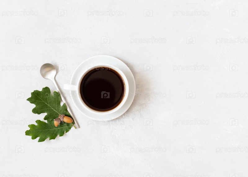 Черный кофе с желудями на белом фоне. Кофе с желудями в белой чашке с местом для текста. Вид сверху, плоская планировка
