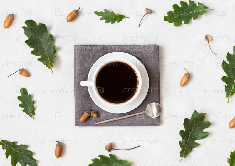 Осенний натюрморт с черным кофе на серой салфетке с желудями и листьями. Желудевый кофе на белом фоне. Вид сверху, плоская планировка