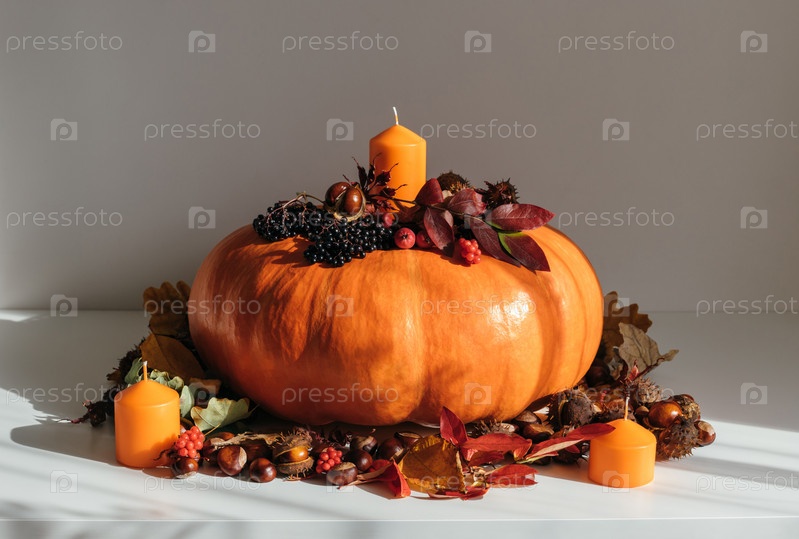 Красивая осенняя композиция с тыквой, свечами и осенним декором на белом столе. Осенние праздничные украшения на День благодарения