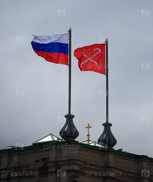 Флаг России и флаг Санкт-Петербурга на крыше здания на фоне пасмурного неба