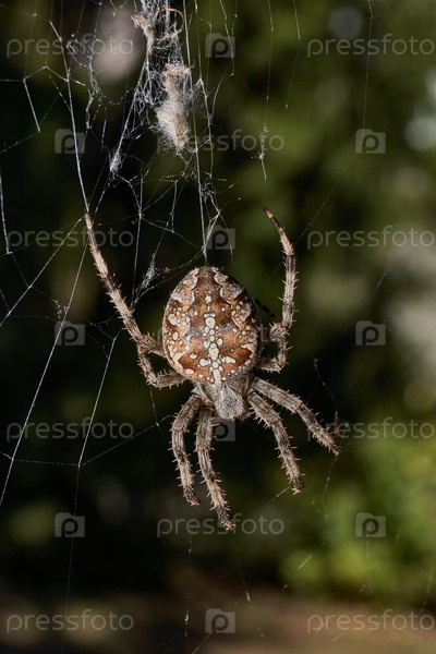 Аранеус сидит в центре паутины и ждет добычи, попавшей в сеть