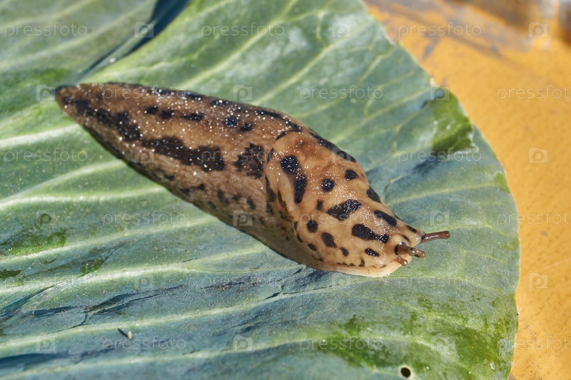 Большой слизь (Limax maximus) ползёт по листьям капусты.Большой слизь или большой леопардовый слизь наземный брюхоногий моллюск отряда лёгочных улиток семейства Limacidae