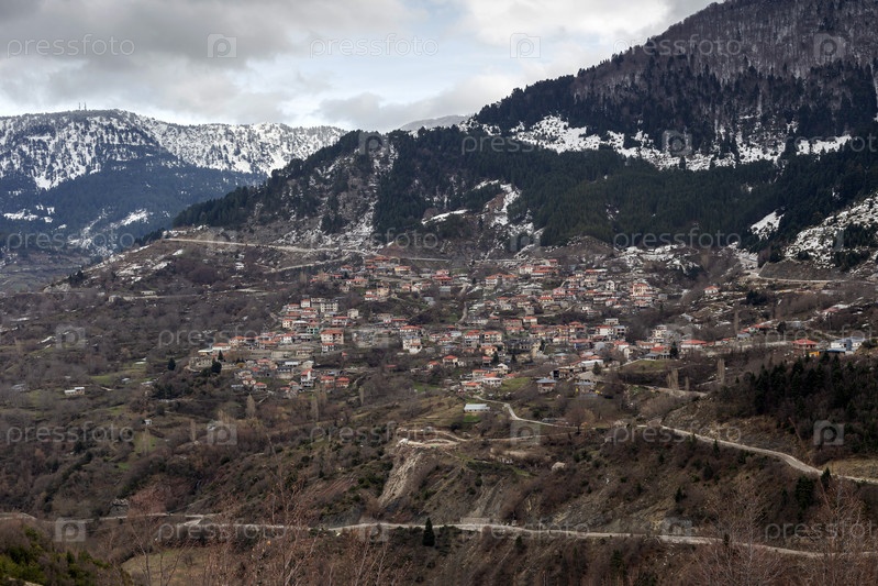 Вид на деревню Мецово (Греция, Эпир) и заснеженные горы зимой в пасмурный день