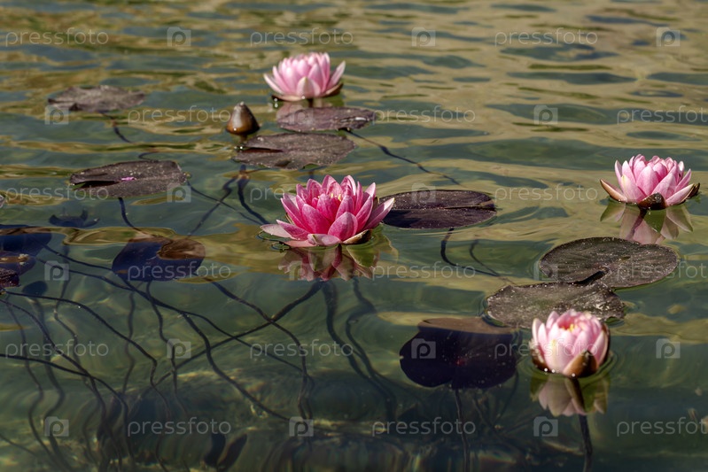 Розовые кувшинки растут в пруду крупным планом