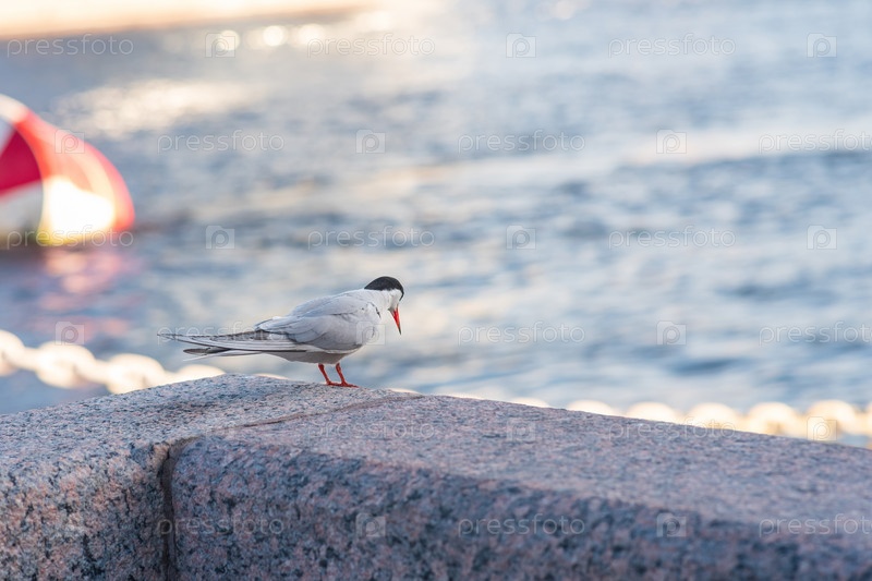 Птица обыкновенная крачка на гранитном парапете над водой