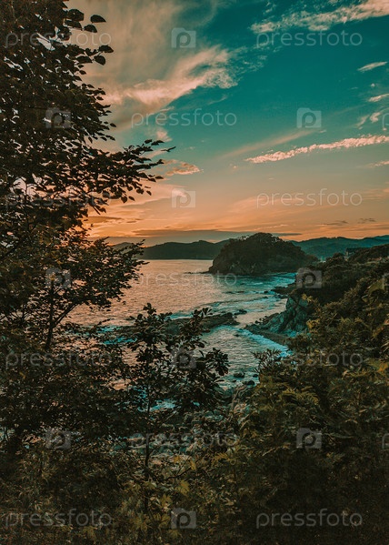 Морской пейзаж, горы и море на закате. Восход солнца над океаном с видом на горы и водохранилище. Выборочная фокусировка