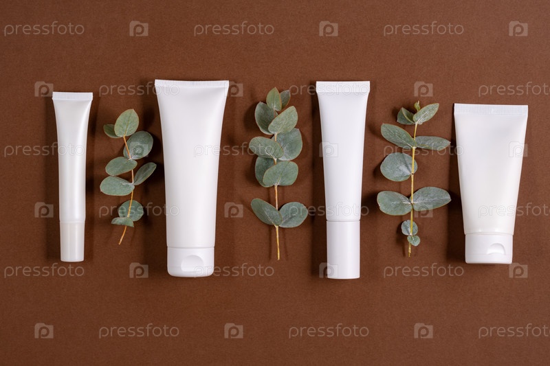 Вид сверху на белые косметические тюбики с элегантным дизайном, расположенные на коричневом бумажном фоне с ветками эвкалипта, что идеально подходит для брендинга