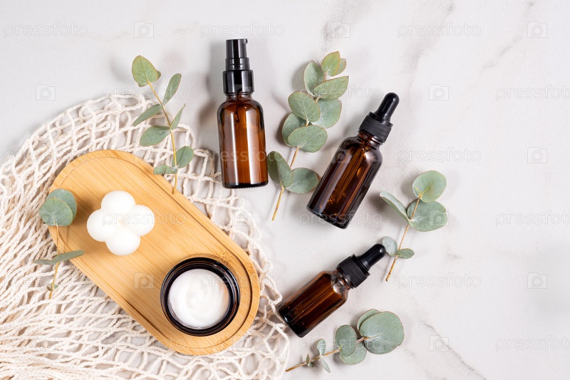 Элегантный набор косметических средств с эвкалиптом в янтарных стеклянных флаконах и банках на белом мраморном фоне, символизирующий органическую косметику