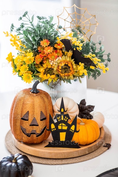 Ваза с цветами, тыквы и страшный замок с ведьмой на фоне интерьера белой кухни в скандинавском стиле. Концепция дома и уюта. Осенний декор на Хэллоуин