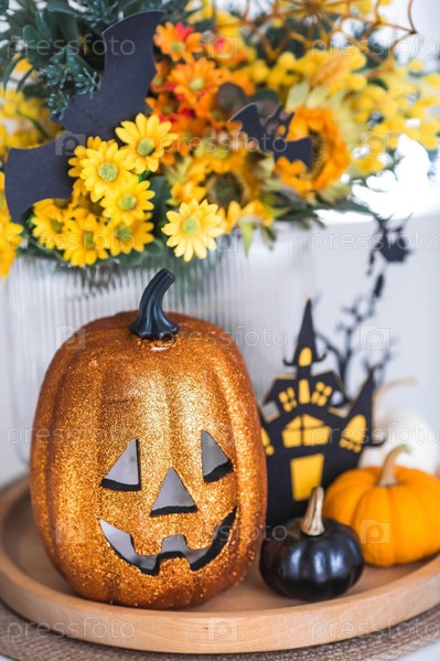 Ваза с цветами, тыквы и страшный замок с ведьмой на фоне интерьера белой кухни в скандинавском стиле. Концепция дома и уюта. Осенний декор на Хэллоуин