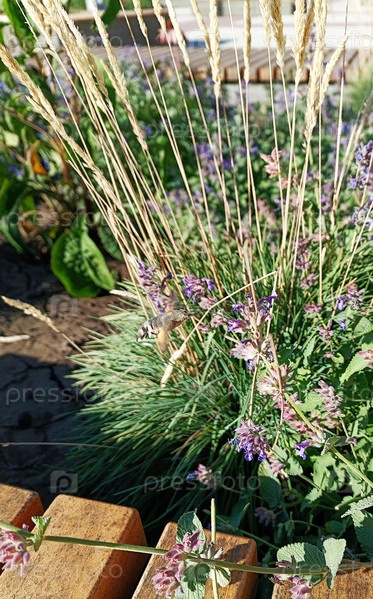 Бабочка-колибри или бражник-языкан завис в воздухе и пьет нектар из цветка в сквере Тольятти