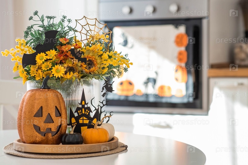 Ваза с цветами, тыквы и страшный замок с ведьмой на фоне интерьера белой кухни в скандинавском стиле. Концепция дома и уюта. Осенний декор на Хэллоуин