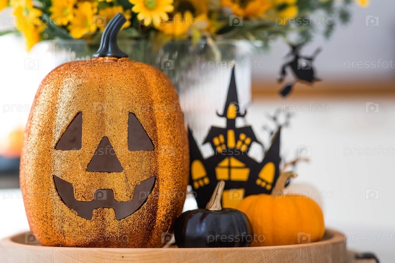 Ваза с цветами, тыквы и страшный замок с ведьмой на фоне интерьера белой кухни в скандинавском стиле. Концепция дома и уюта. Осенний декор на Хэллоуин