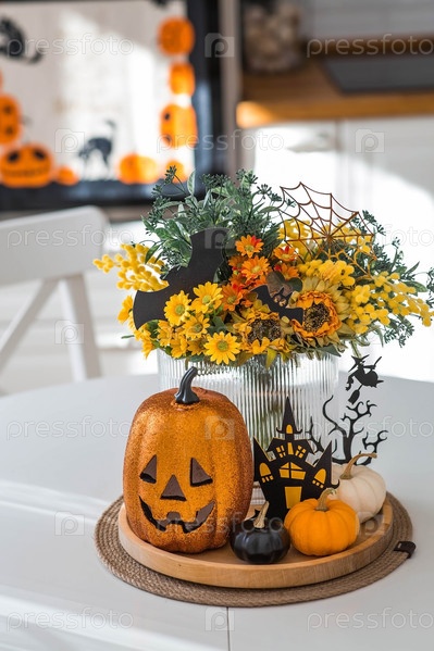 Ваза с цветами, тыквы и страшный замок с ведьмой на фоне интерьера белой кухни в скандинавском стиле. Концепция дома и уюта. Осенний декор на Хэллоуин