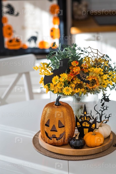 Ваза с цветами, тыквы и страшный замок с ведьмой на фоне интерьера белой кухни в скандинавском стиле. Концепция дома и уюта. Осенний декор на Хэллоуин