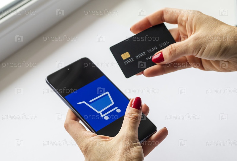 Снимок женщины, держащей кредитную карту и телефон. Технологии