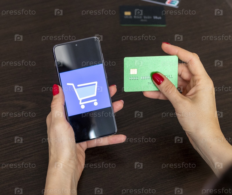 Снимок женщины, держащей кредитную карту и телефон. Технологии