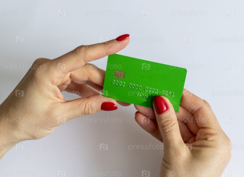Снимок женщины, держащей зеленую кредитную карту. Бизнес