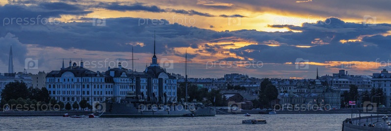Крейсер Аврора на фоне Нахимовского училища в лучах заката