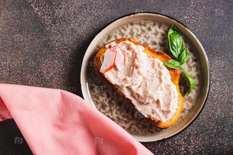 Крупный план крабовых палочек и огуречного паштета на тосте на тарелке на столе, вертикальный вид