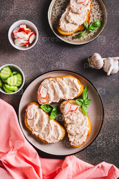 Вкусные сэндвичи с крабовым мясом и огуречным паштетом на тарелке сверху и вертикально
