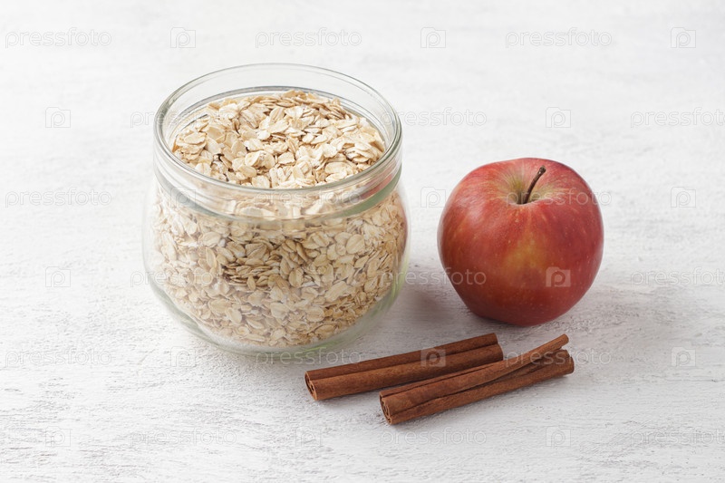 Сырые овсяные хлопья в стеклянной банке с палочками корицы и яблоками на светло-сером текстурированном фоне