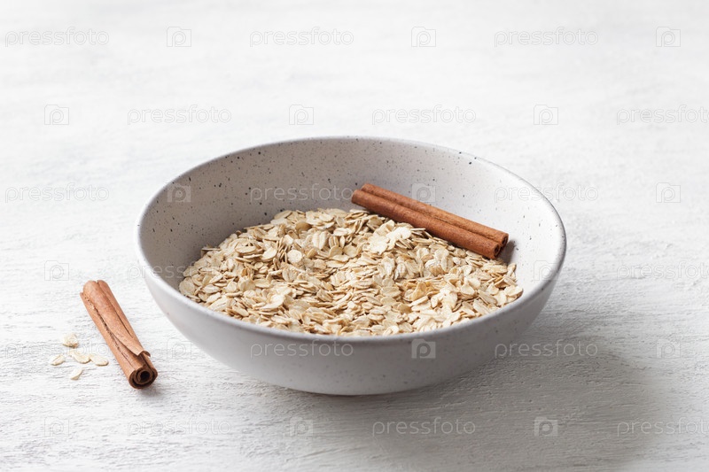 Сырые овсяные хлопья в керамической миске с палочками корицы на светло-сером текстурированном фоне
