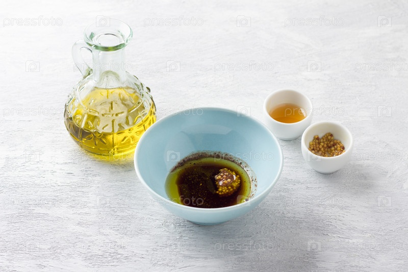 Светло-голубая миска с оливковым маслом, бальзамическим соусом, медом, зерновой горчицей и специями на светло-сером фоне. Готовим домашнюю заправку для салата