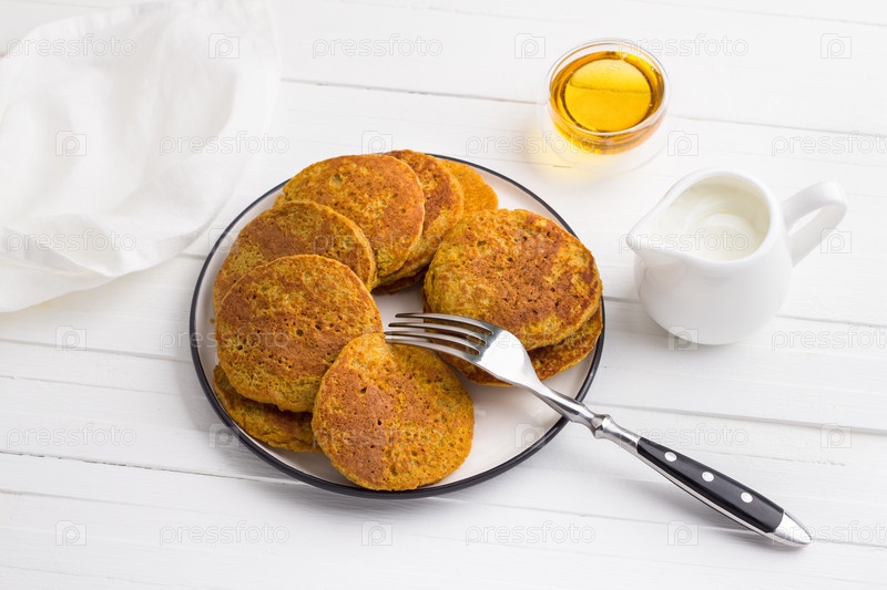 Здоровые тыквенные блины с овсянкой, подаются с медом и сливками на белом фоне. Вкусная вегетарианская еда